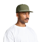 • Single panel at front, plastic snapback, tonal under-peak lining, mesh structure support, contrast matte nylon rope at front of crown, flat peak